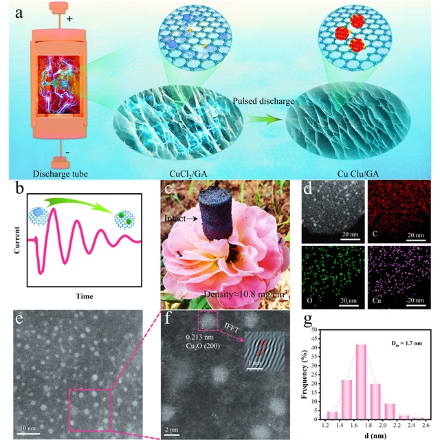 电催化二氧化碳还原技术可将温室气体转化为具有高附加值的多碳化合物(C2+),其中乙醇因其能量密度高、储运便捷且应用广泛,被视为理想的绿色燃料与工业原料。然而,传统催化剂在反应中面临碳-碳键耦合能垒高、产物选择性低及稳定性不足等挑战。针对这一难题,研究团队提出“非对称纳米团簇催化剂”设计理念,创新性地利用瞬态脉冲放电技术成功制备出石墨烯气凝胶负载铜纳米团簇催化剂(Cu Clu/GAs),其独特的Cu₄O-CuC₂O₁原子相互作用结构显著提升了二氧化碳还原为乙醇的效率与稳定性。