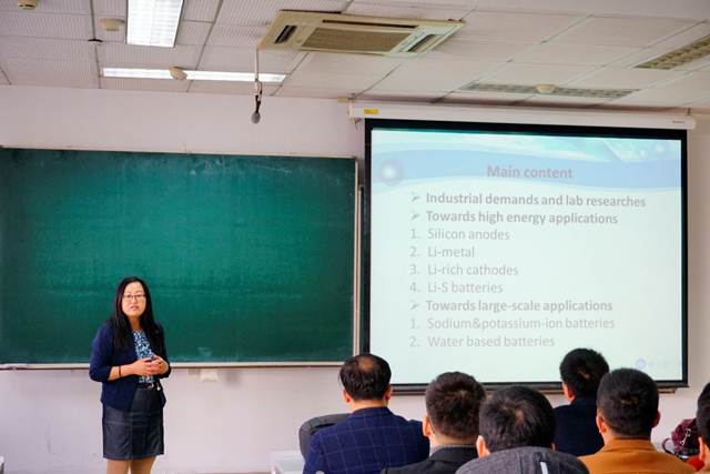 在这次演讲中,郭再萍教授详细介绍了她的研究团队近几年在金属离子电池的先进电极材料领域的最新成果,向我们阐述了在合成不同类型的混合纳米结构电极材料以提高金属离子电池的电化学储能性能方面的一些最新进展。报告的互动交流环节,郭再萍教授还就中子辐射测试和红外显微成像等问题与在场师生进行了讨论和交流。