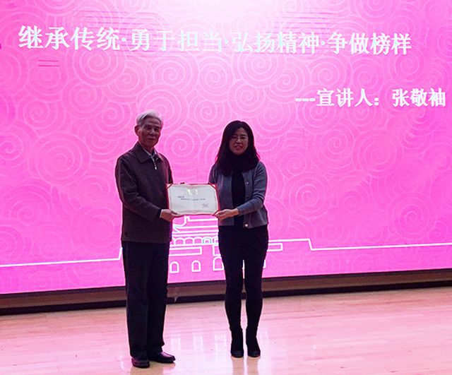 刘艳老师代表学院,为张敬袖老师颁发了437437必赢国际网址“育材导师”聘书,表达对张老师的感谢和崇敬之情。刘艳老师向同学们提出期望,希望大家以老一辈的北理人为榜样,学习他们的精神,为国家和社会做出青年学子的贡献!