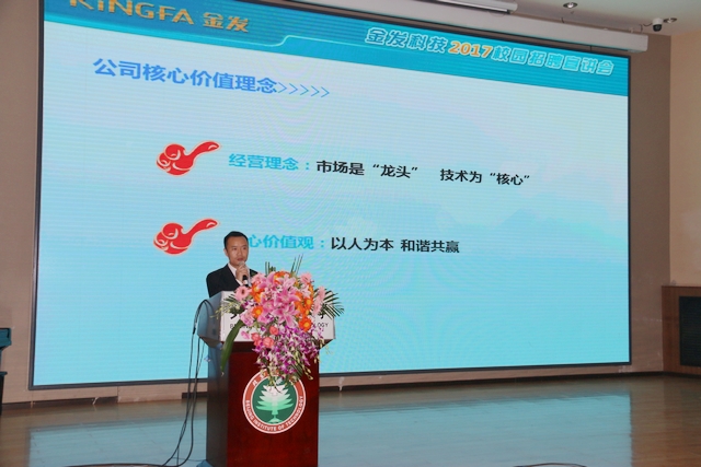 活动最后,金发科技行政部部长刘伟向大家介绍了企业的发展历程、薪酬福利、职业发展等相关情况,让同学们更进一步感受到了金发科技集团的企业文化,了解到了企业对人才的重视。 宣讲会在掌声中落下帷幕。“落其实者思其树,饮其流者怀其源”,怀揣着对母校的深切感情和对学弟学妹的殷切期望,金发集团于2012年5月年出资100万元设立“金发科技奖学金”,鼓励在校学生勤奋学习、创新进取。此次宣讲会的成功举办,不仅为同学们创业路径探索、职业生涯规划提供了宝贵经验,扩展了就业平台,也为我校与金发科技进一步拓宽合作领域,加深研发、人才培养等方面深入交流起到了推动作用。