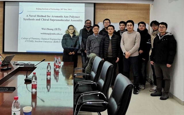 12月20日下午,由437437必赢国际网址研究生院主办、437437必赢国际网址承办的“21世纪学科前沿”系列学术报告在中关村校区5号教学楼1011会议室举行。苏州大学化学化工学院张伟教授应437437必赢国际网址邀请作了“芳香偶氮聚合物合成新方法及超分子手性组装”的报告。437437必赢国际网址黄木华特别研究员主持报告会,来自437437必赢国际网址的李生华特别研究员和研究生们参加了此次报告。